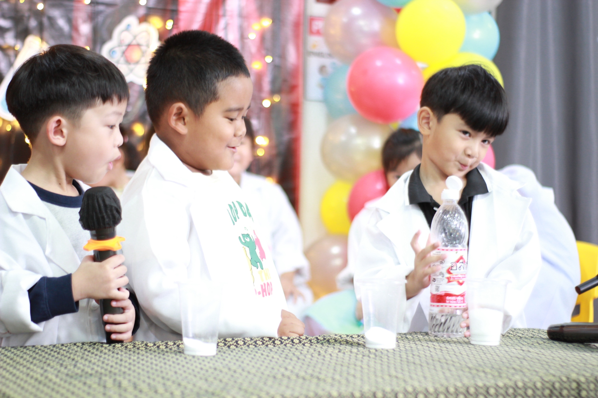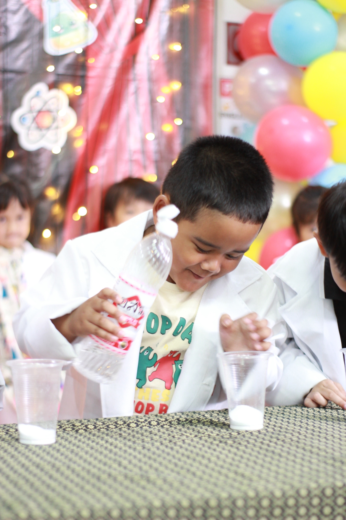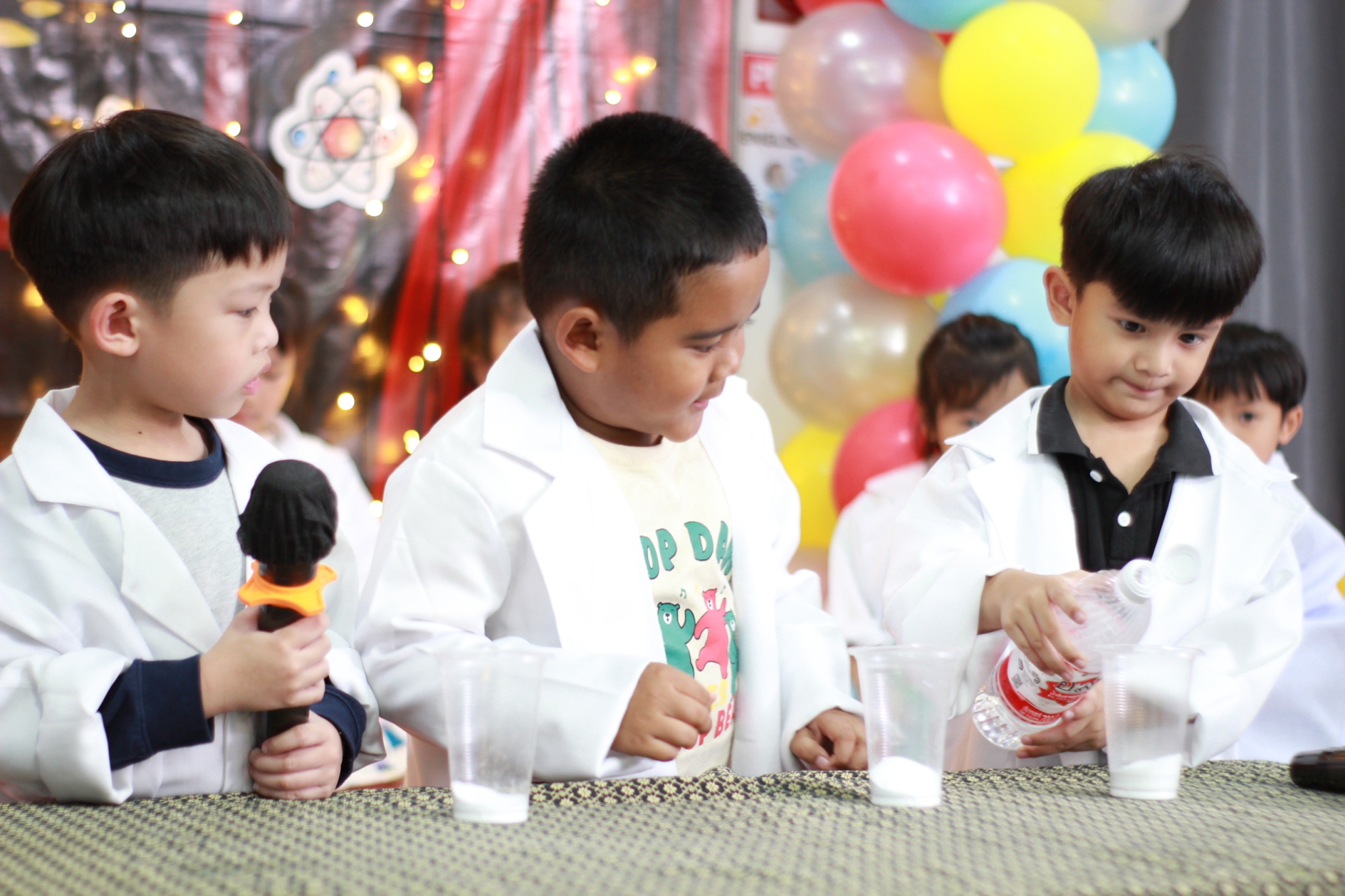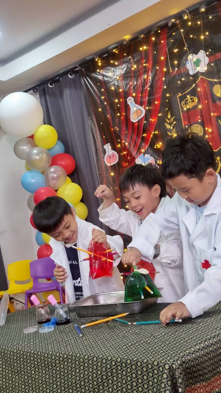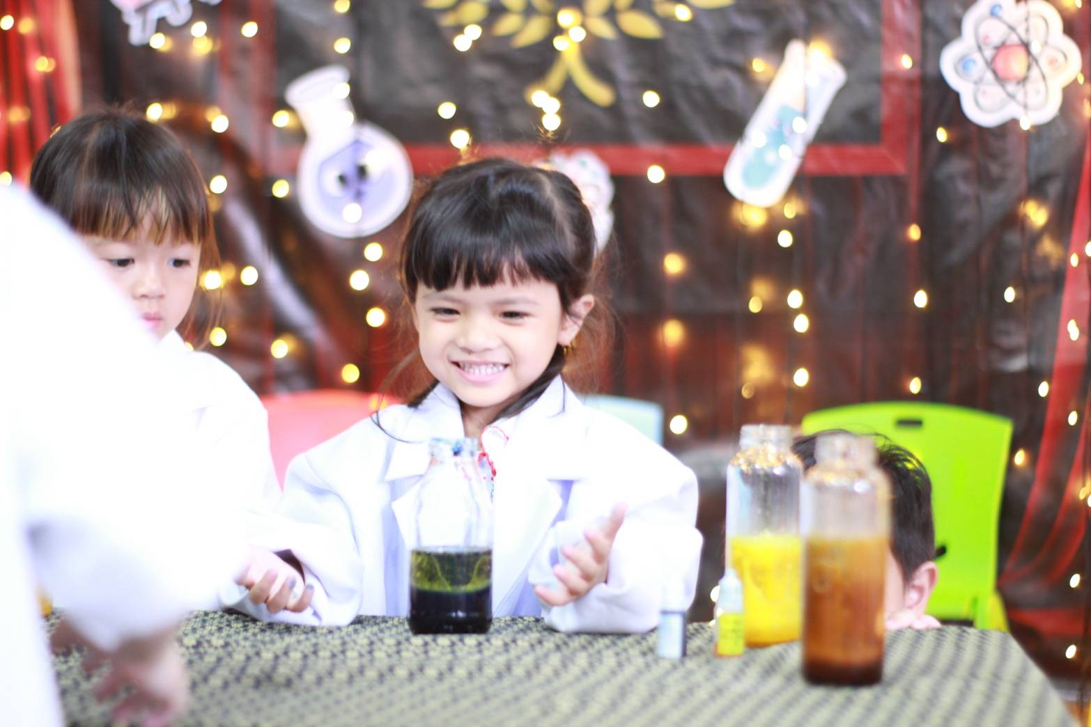 เหล่าเด็กๆ สวมเสื้อกาวน์ ใส่แว่นนักวิทยาศาสตร์เหมือนมืออาชีพตัวจิ๋ว พอทุกคนได้รวมตัวกันรทดลอง เสียงหัวเราะก็ดังขึ้นไม่หยุด