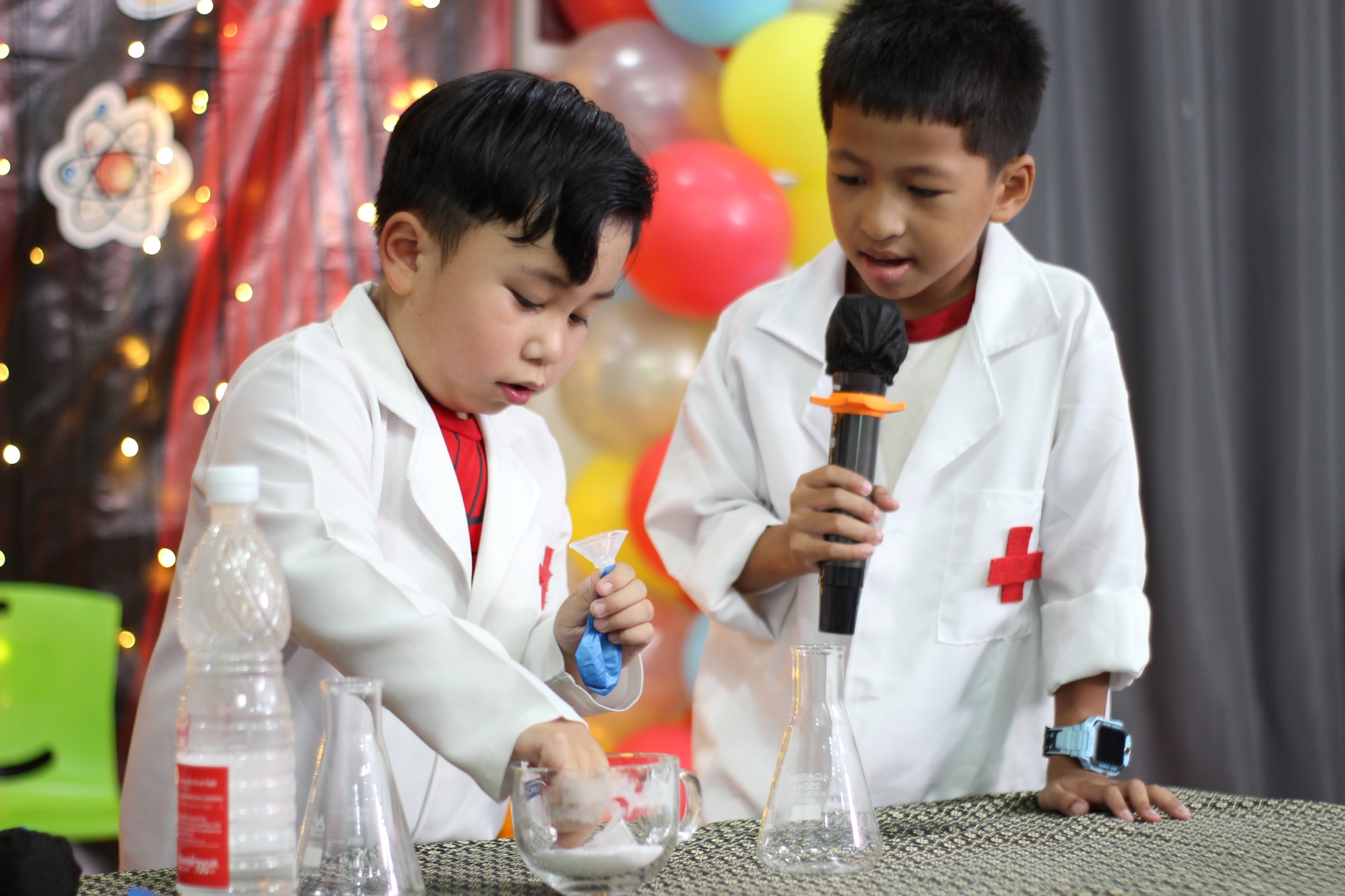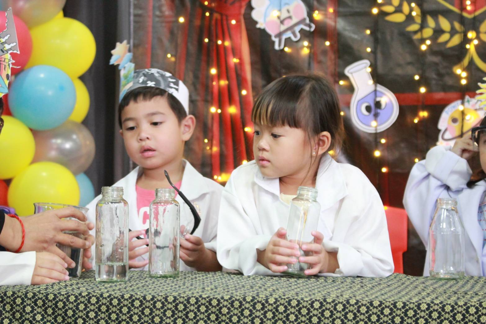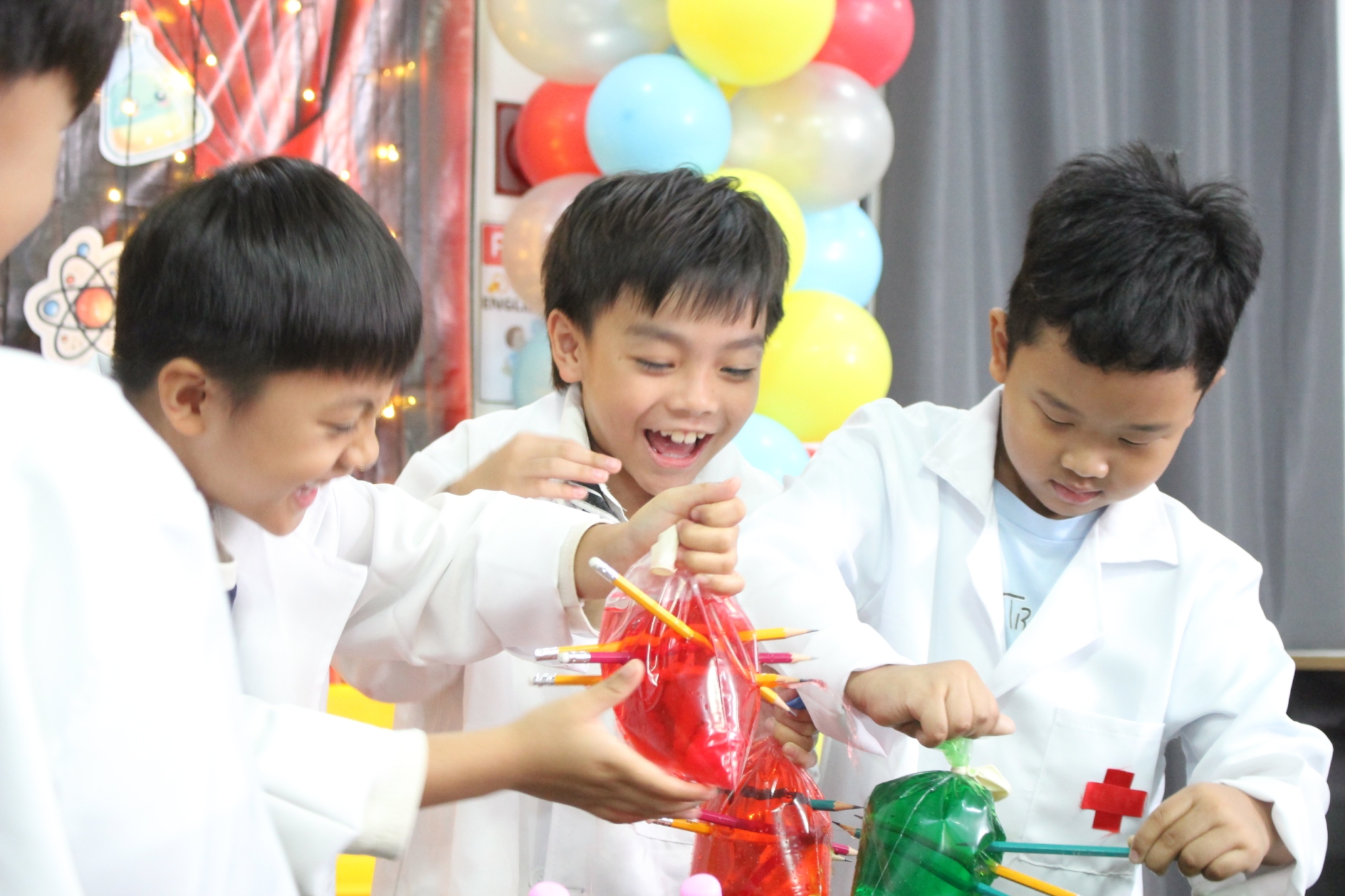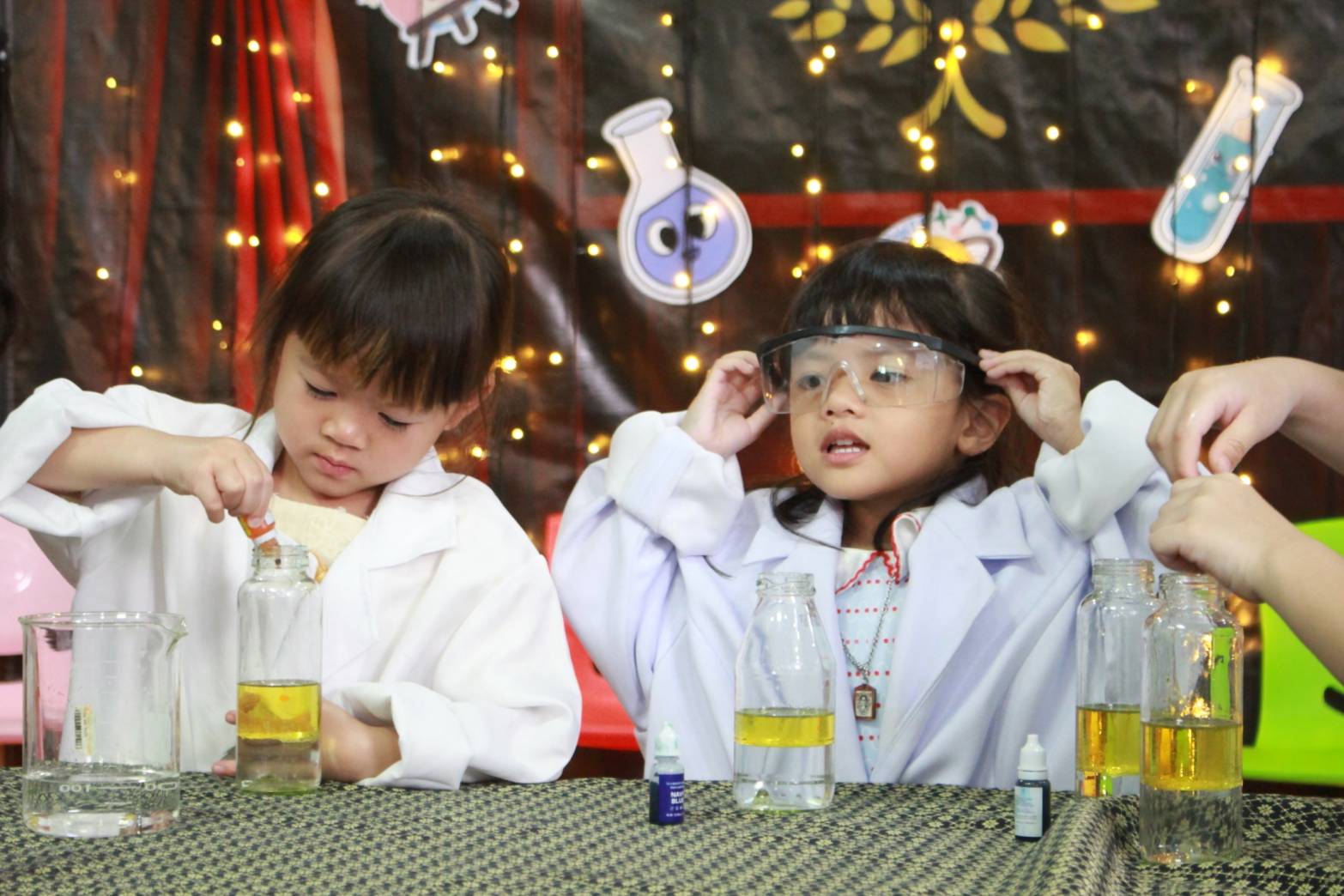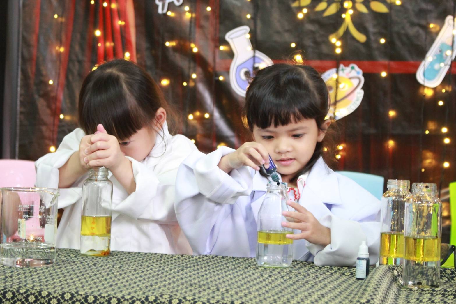 เหล่าเด็กๆ สวมเสื้อกาวน์ ใส่แว่นนักวิทยาศาสตร์เหมือนมืออาชีพตัวจิ๋ว พอทุกคนได้รวมตัวกันรทดลอง เสียงหัวเราะก็ดังขึ้นไม่หยุด