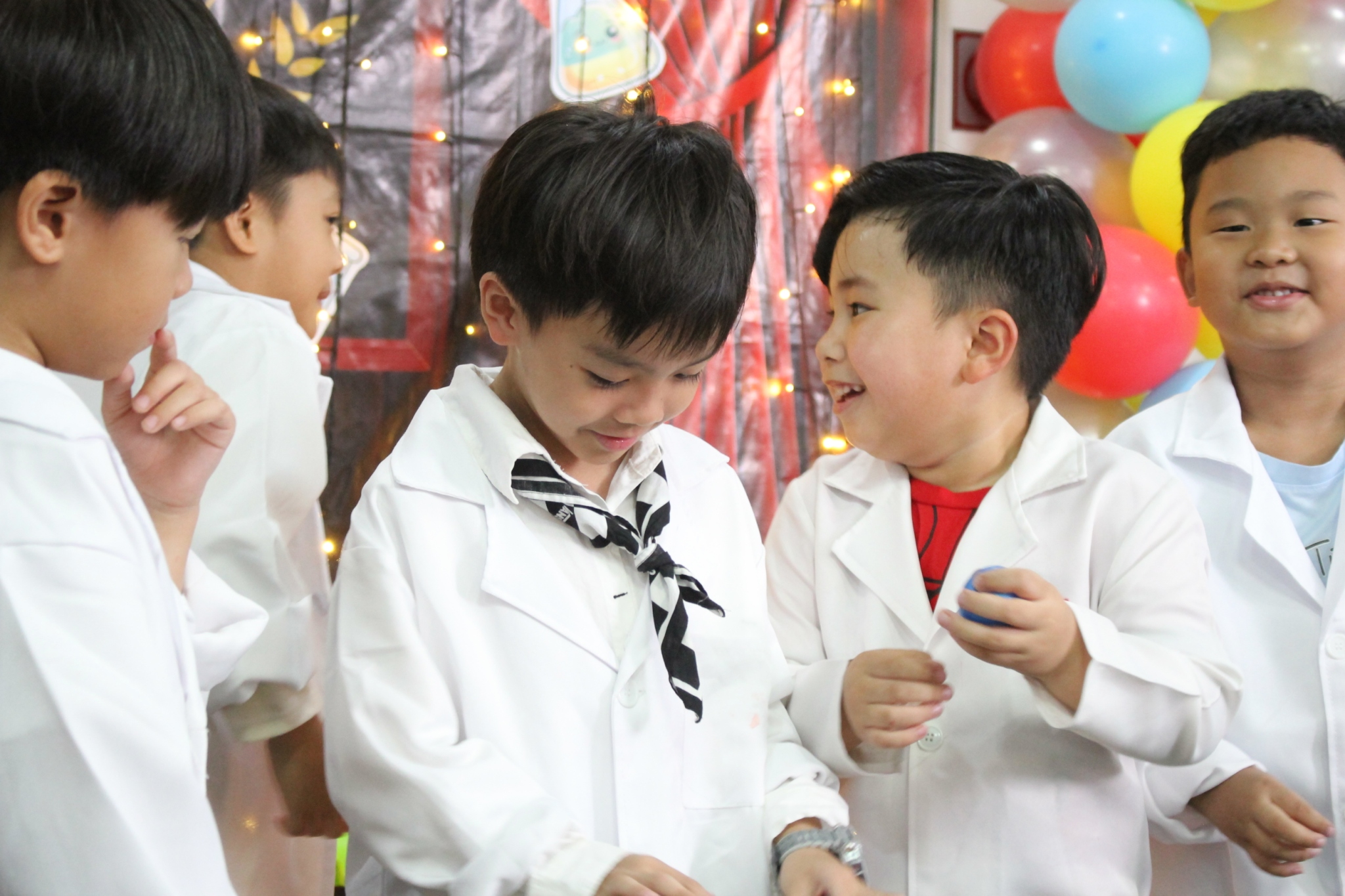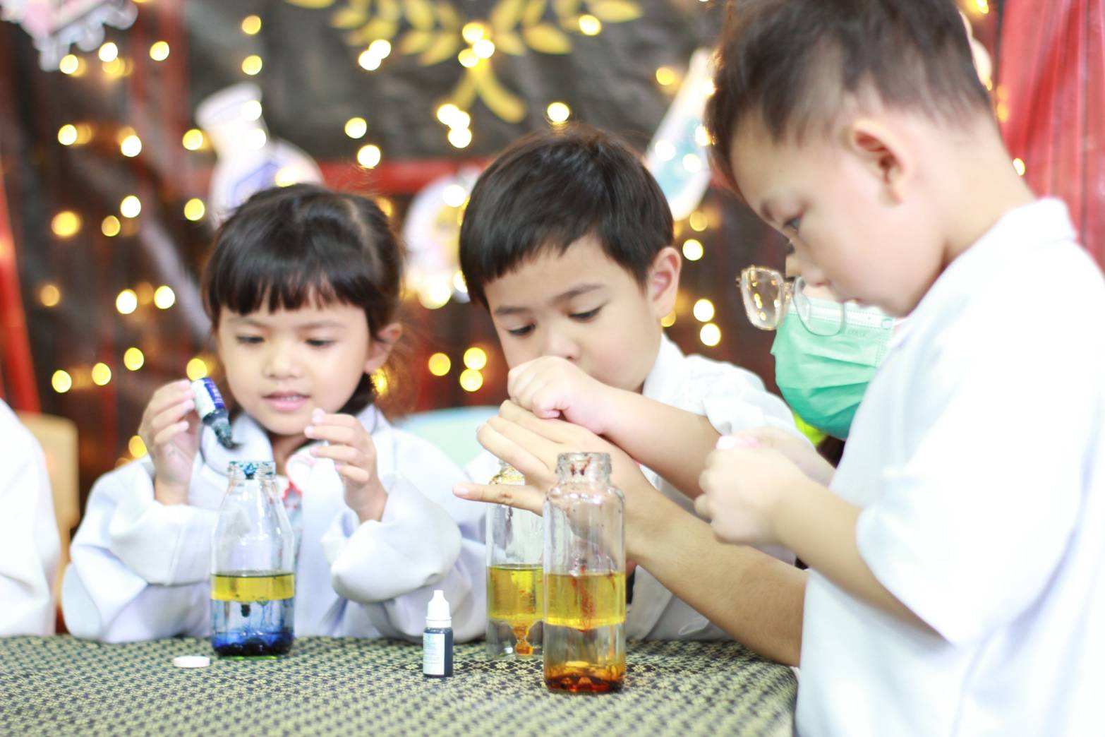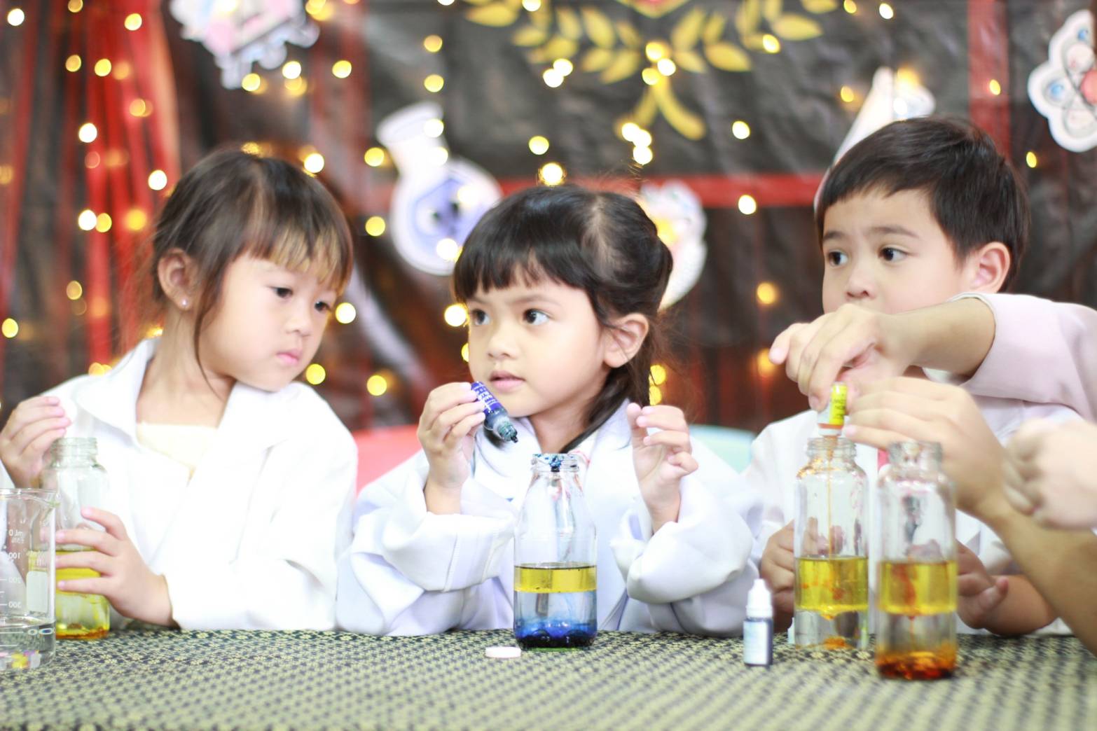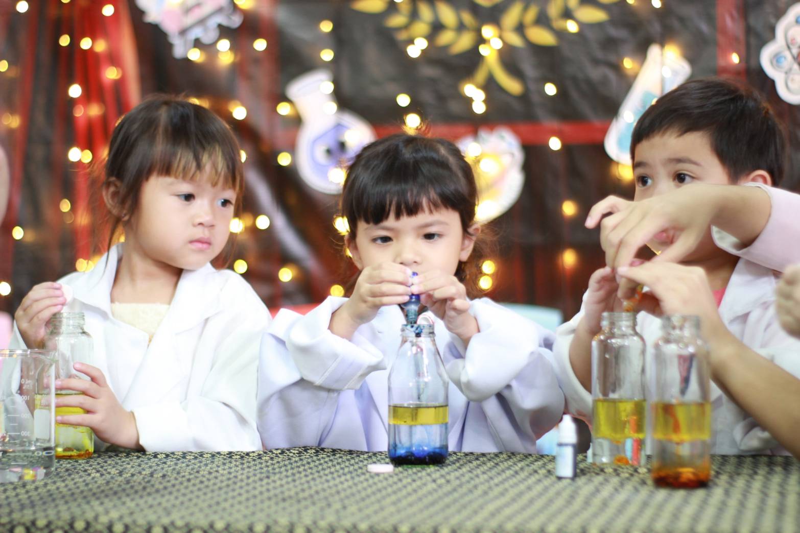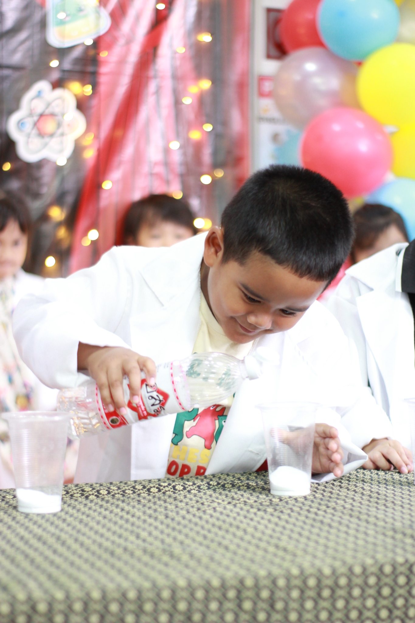 เหล่าเด็กๆ สวมเสื้อกาวน์ ใส่แว่นนักวิทยาศาสตร์เหมือนมืออาชีพตัวจิ๋ว พอทุกคนได้รวมตัวกันรทดลอง เสียงหัวเราะก็ดังขึ้นไม่หยุด