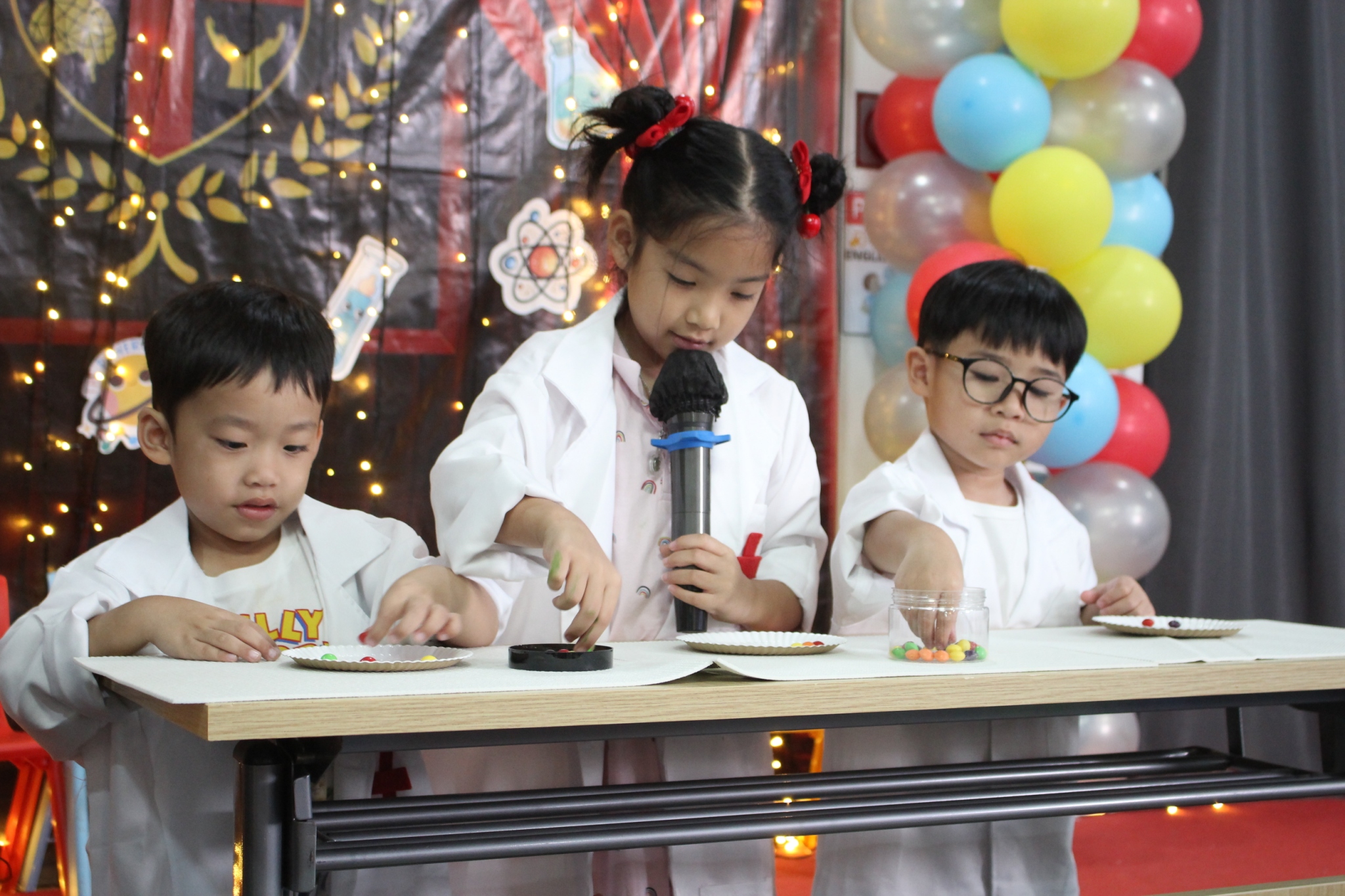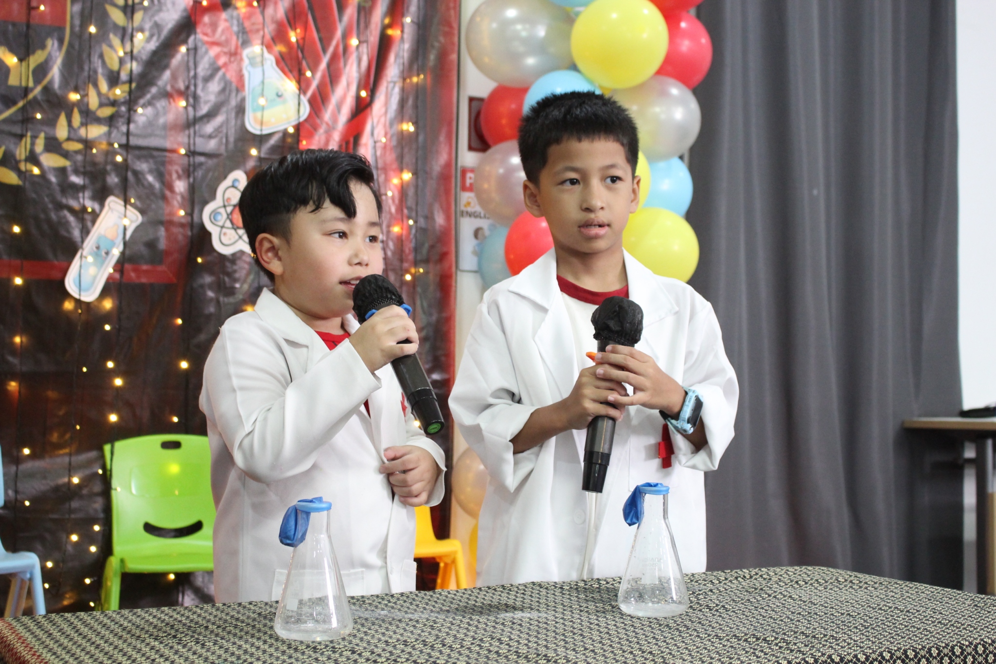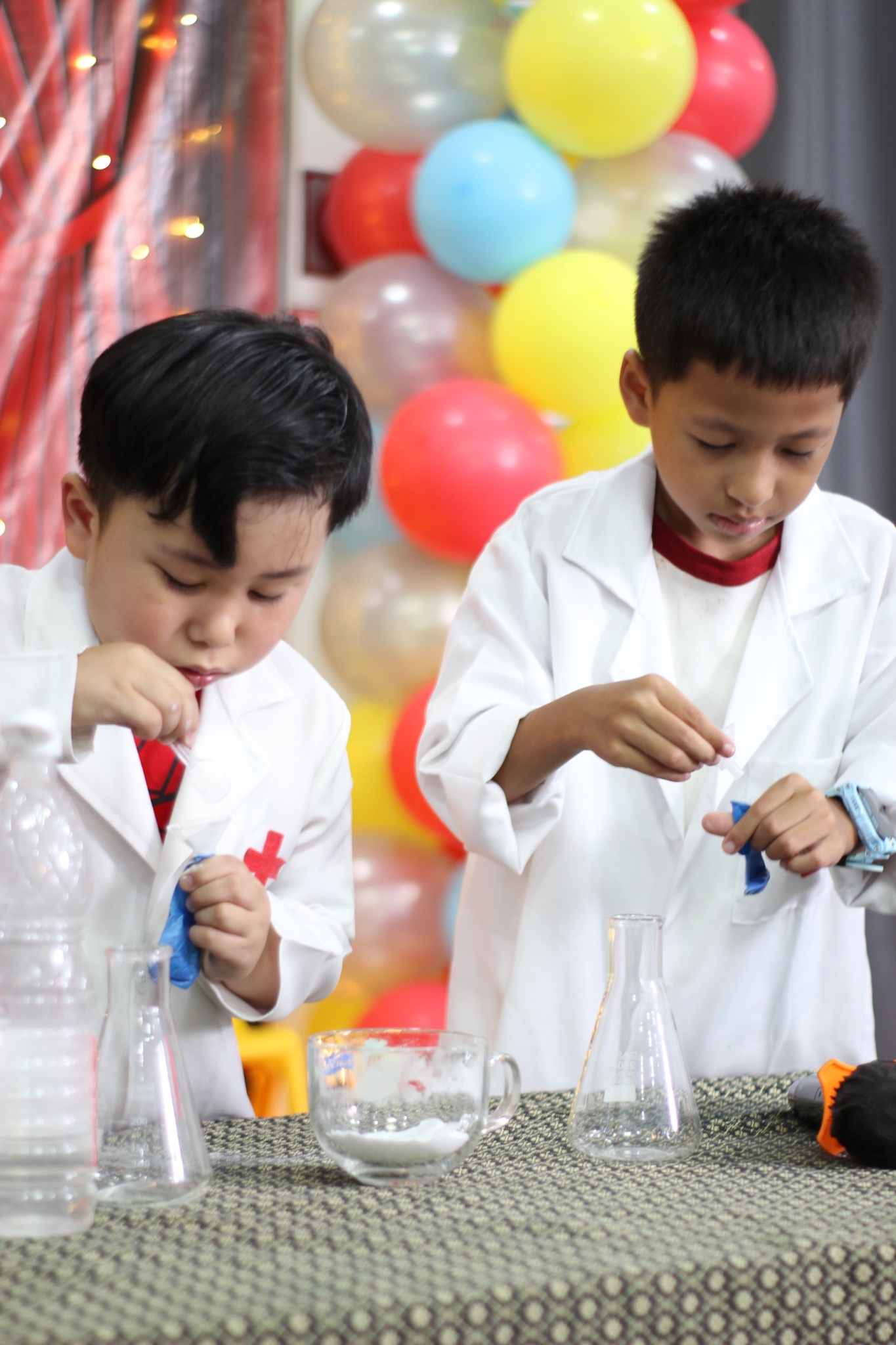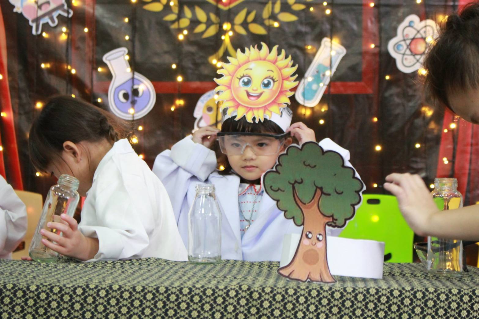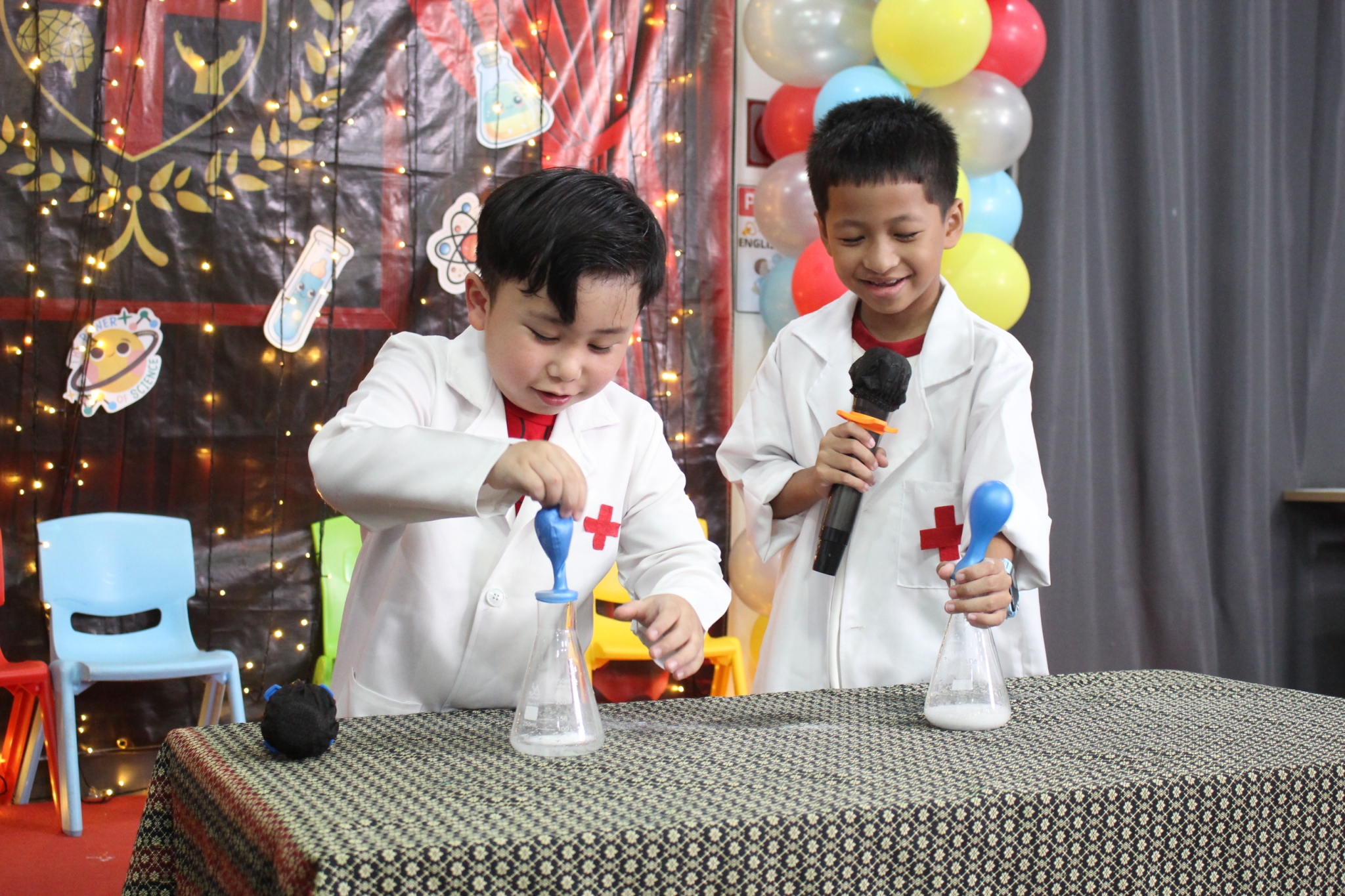 เหล่าเด็กๆ สวมเสื้อกาวน์ ใส่แว่นนักวิทยาศาสตร์เหมือนมืออาชีพตัวจิ๋ว พอทุกคนได้รวมตัวกันรทดลอง เสียงหัวเราะก็ดังขึ้นไม่หยุด