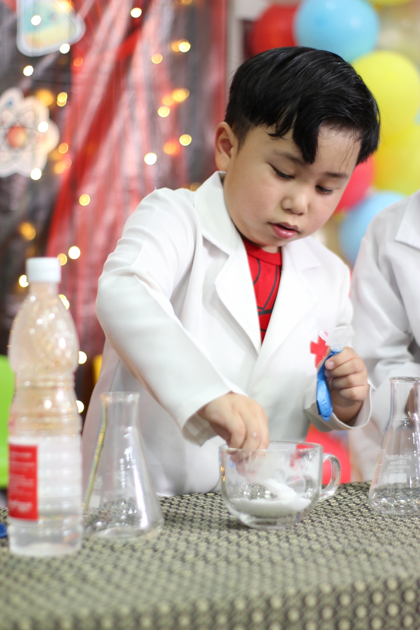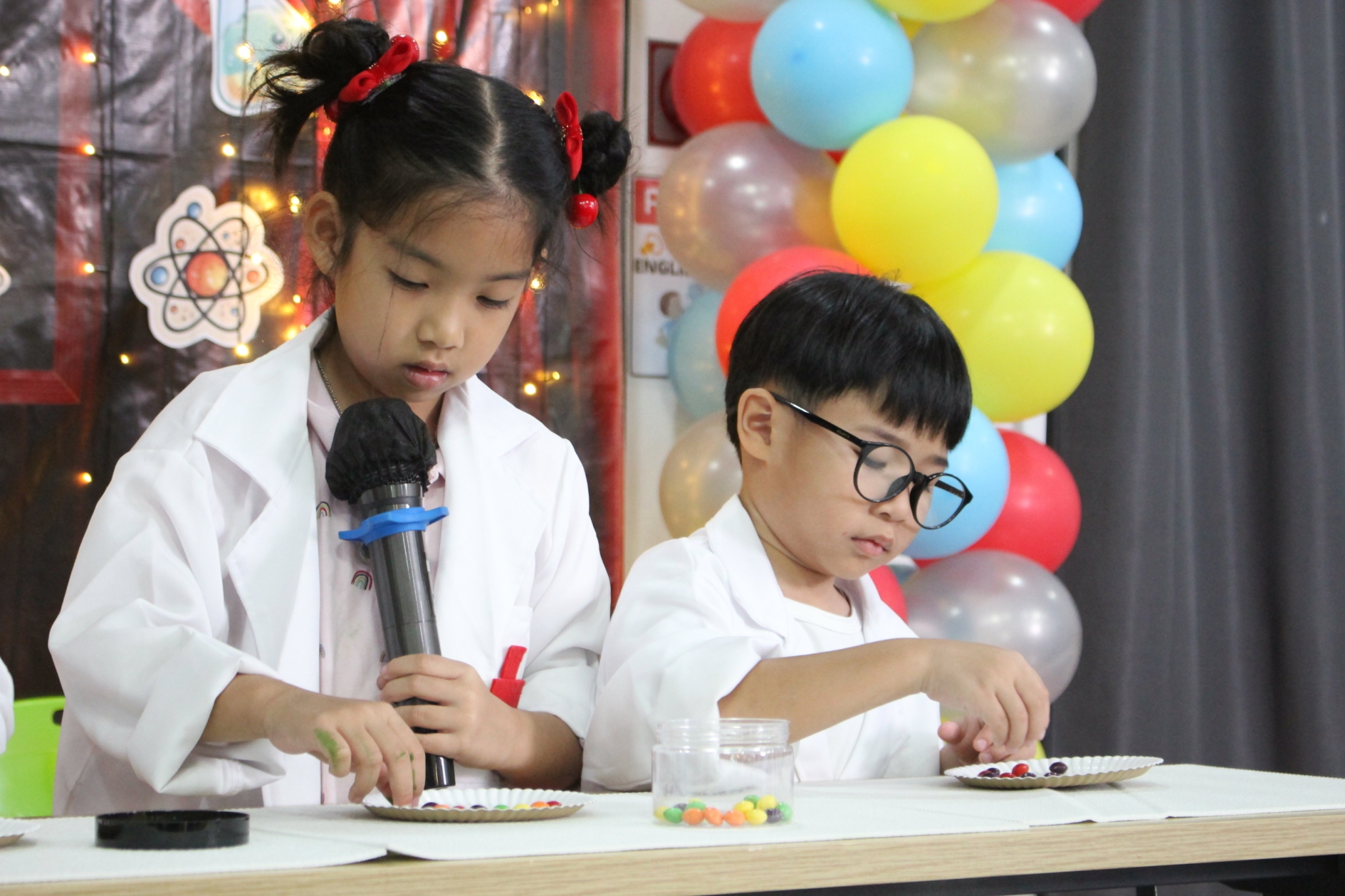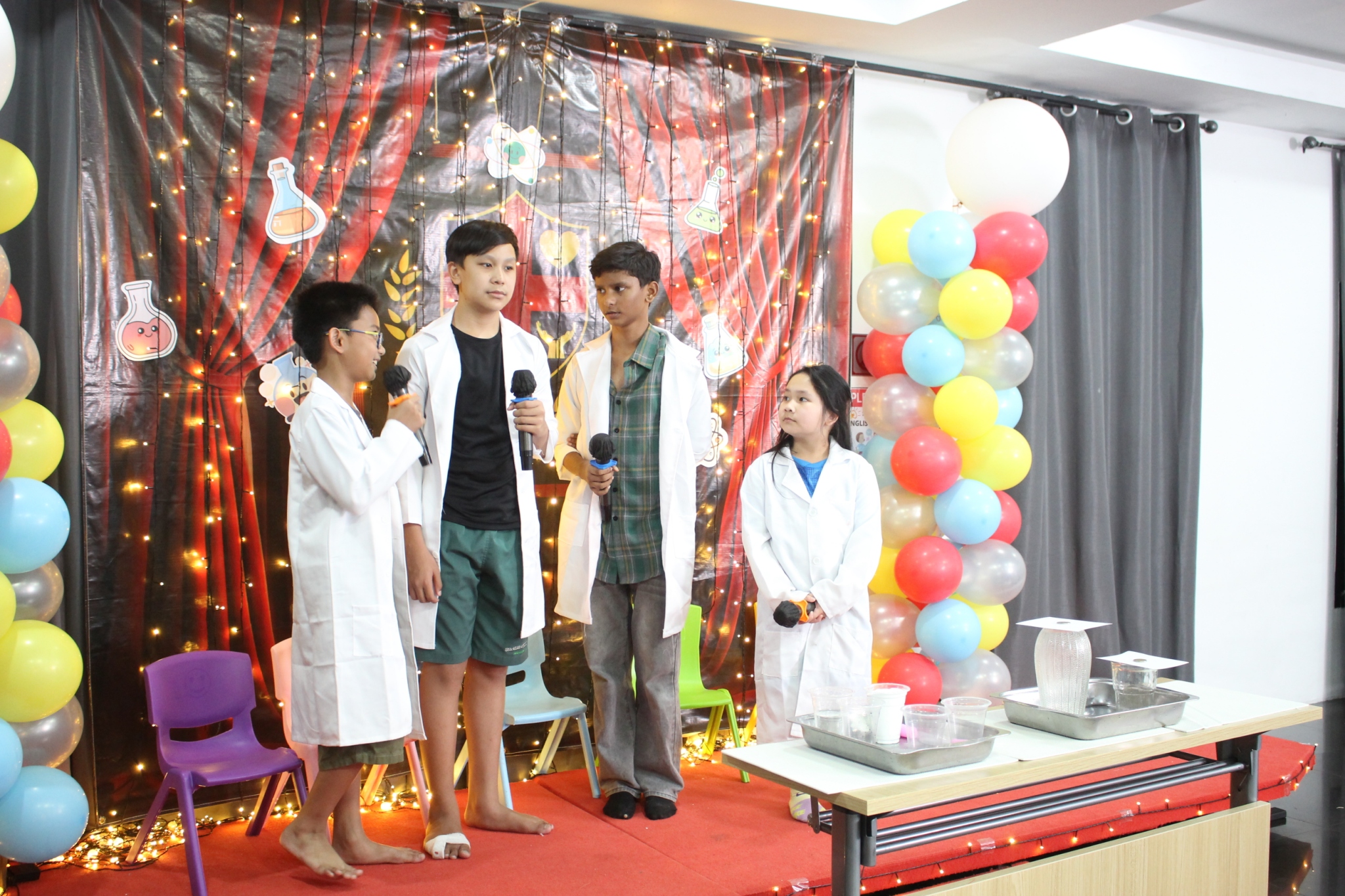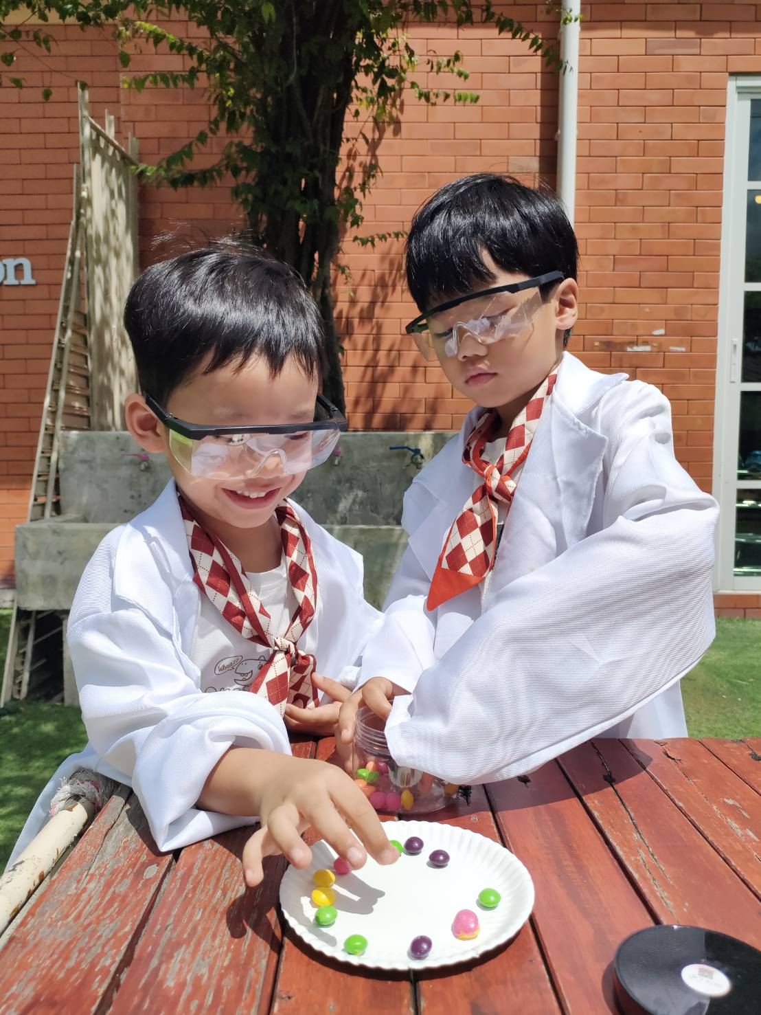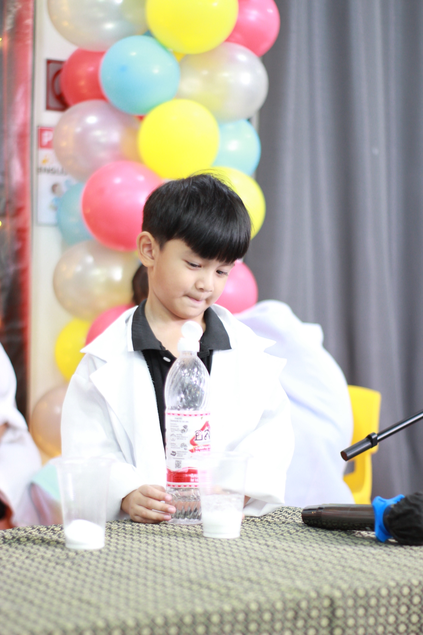 เหล่าเด็กๆ สวมเสื้อกาวน์ ใส่แว่นนักวิทยาศาสตร์เหมือนมืออาชีพตัวจิ๋ว พอทุกคนได้รวมตัวกันรทดลอง เสียงหัวเราะก็ดังขึ้นไม่หยุด